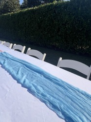 Baby blueRunners:Baby blue runners1 Dusty Blue Gauze RunnerRunners:Dusty Blue Gauze Runner1If you're looking for an elegant yet rustic touch to your event decor, the 20"x120" Dusty Blue Gauze Runner is the perfect choice. This delicate runner adds a serene and calming vibe, making it ideal for weddings, baby showers, and outdoor events. The gauzy texture of the runner creates a beautiful draped effect, adding dimension and depth to your tablescape. The Dusty Blue color complements a variety of themes and adds a touch of sophistication to your decor. You can easily mix and match with other elements to create a unique table setting. Measuring 120 inches long and 20 inches wide, this runner is guaranteed to fit standard-sized tables. With a sewn edge to prevent fraying, you won't have to worry about any accidental damage during your event. Made with high-quality materials, this runner is durable and reusable.